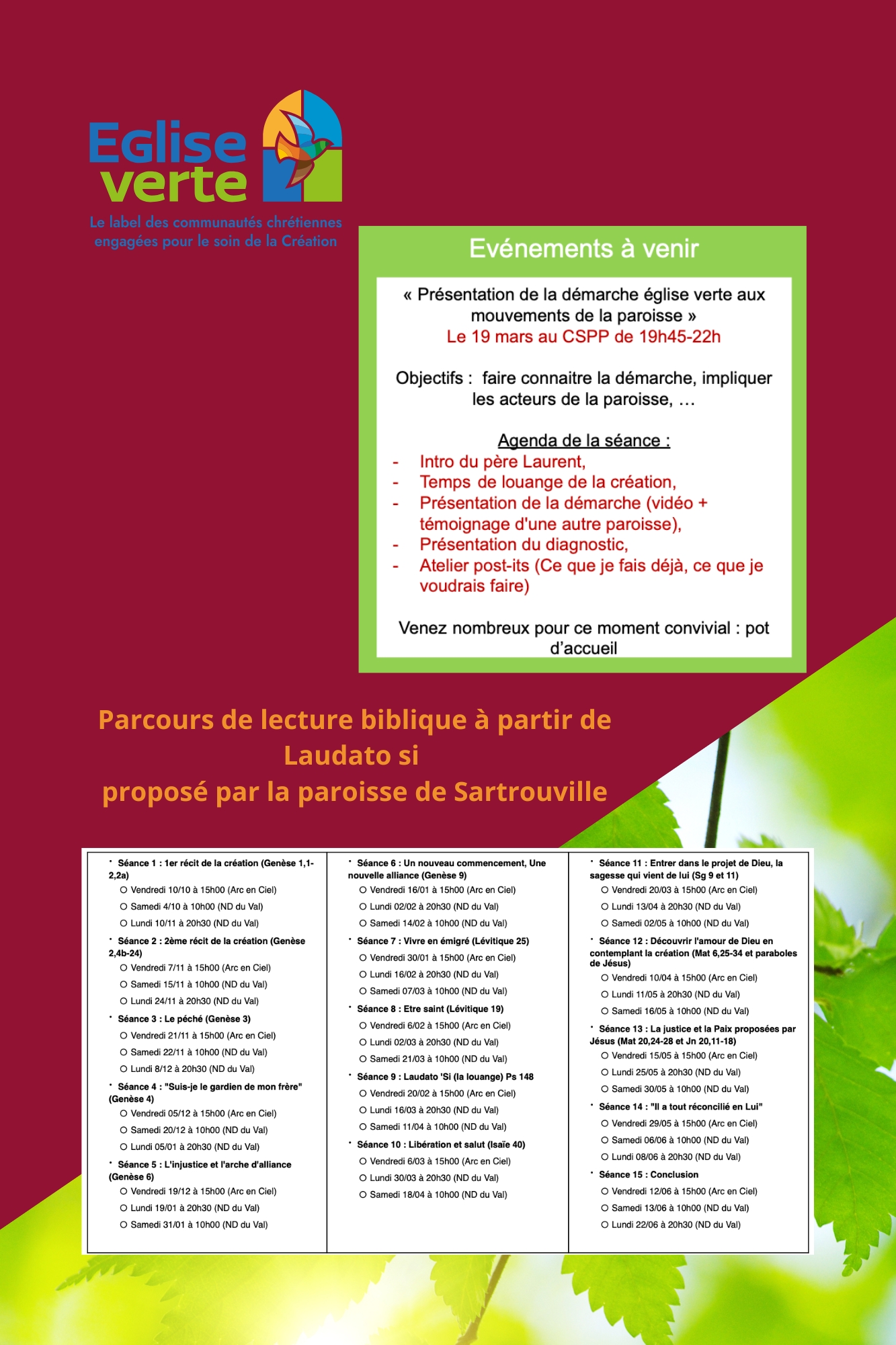 « Les Eglises vertes autour de nous : les 3 paroisses du doyenné (Sartrouville, Houilles, Maisons-Laffitte & Le Mesnil-Le-Roi) sont engagées dans cette démarche. Au niveau du diocèse de Versailles : 16 paroisses catholiques sont actives et labélisées ou en cours de labélisation et une vingtaine vraiment engagées dans des démarches d’écologie intégrale, En France se sont 800-850 paroisses. Au niveau mondial, des milliers de paroisses voire d’institutions catholiques (paroisses, diocèses, congrégations, universités, hôpitaux) sont engagées dans des démarche d’écologie intégrale (Laudato si ou d’autres systèmes de certification souvent œcuméniques). »