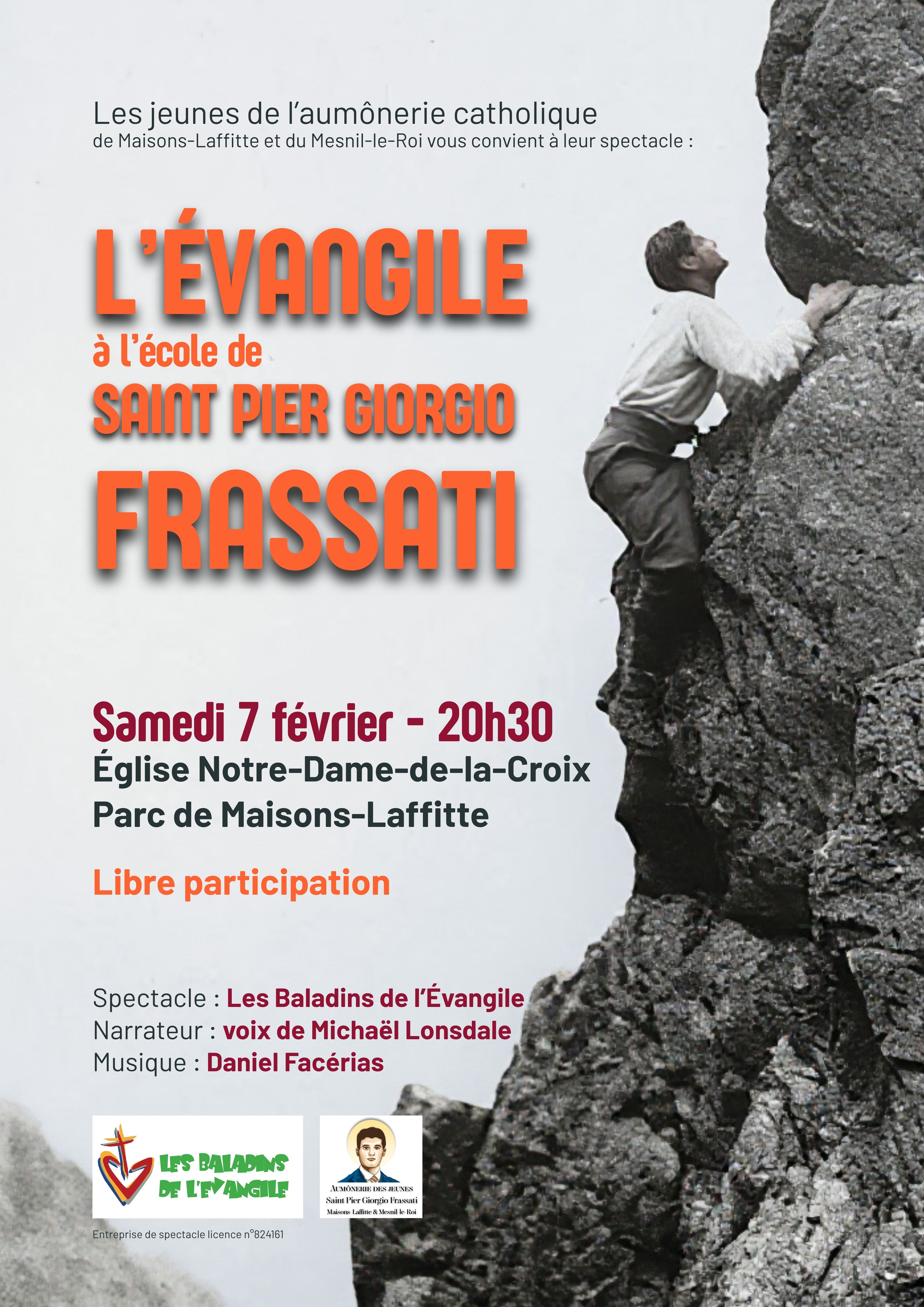 Les jeunes de l’aumônerie de Maisons-Laffitte et du Mesnil-le-Roi vous invitent à découvrir « L’Évangile selon Saint Pier Giorgio Frassati », un spectacle original en collaboration avec les Baladins de l’Evangile qui sera présenté le samedi 7 février 2026 à 20h30, à l’église Notre-Dame-de-la-Croix.